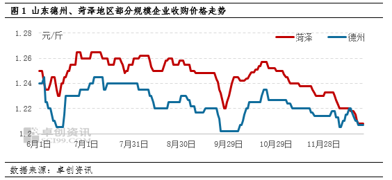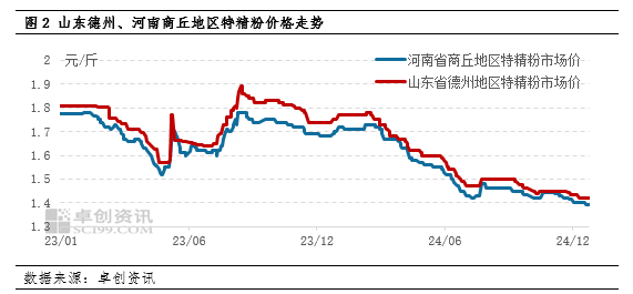 面粉产能过剩及消费信心不强的情况下,面粉价格竞争的表现更为普遍。自11月下旬开始,面粉企业以及下游面粉经销商间以价竞市的操作较为明显,使得经销商贸易利润压缩,亦影响部分经销商走货速度也使得部分企业的市场份额被动减少,因此部分厂家不得已跟随下调面粉价格,市场价格交易重心逐步下探。面粉价格持续走低,使得下游终端客户维持刚需交易,面粉企业订单处于较低水平,因此在无排单计划的情况下,企业缺乏加工需求,企业收购意愿下降,对小麦价格不利。