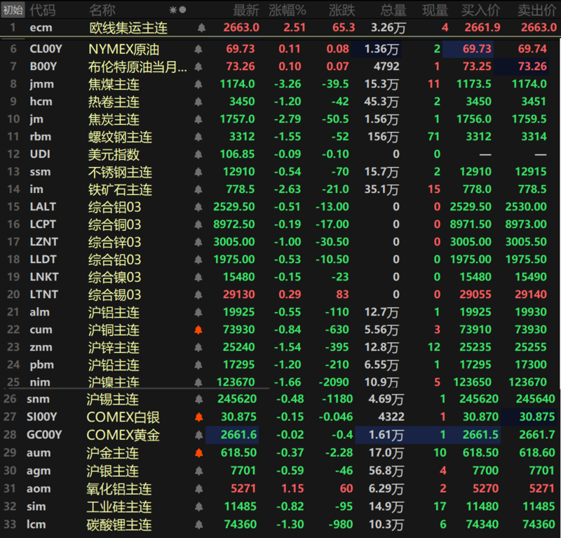 此外,碳酸锂主连跌1.3%,工业硅主连跌0.82%,欧线集运主连涨2.51%。