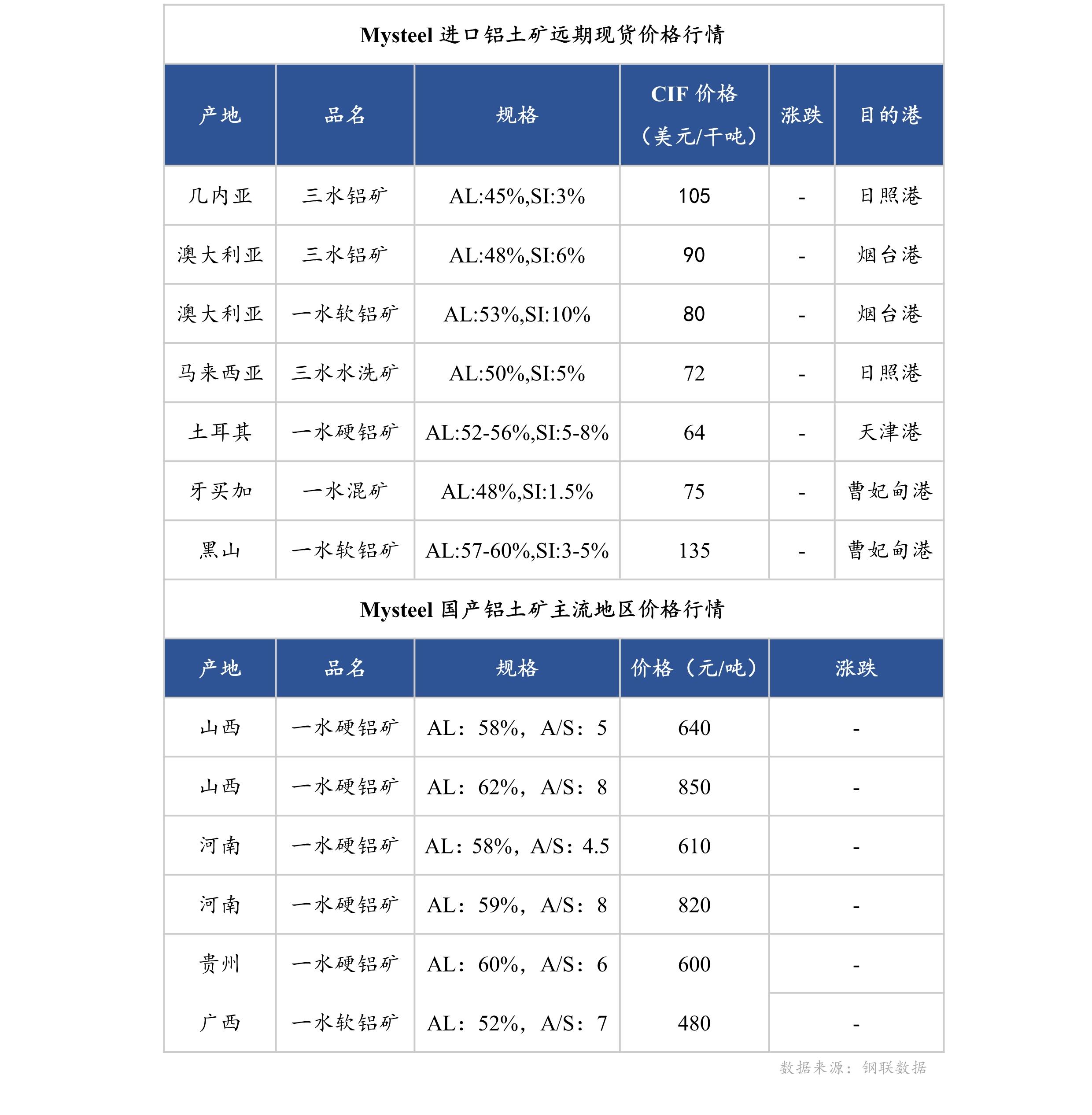 进口矿方面价格高位持稳。主流铝土矿供应国发运受限,现货难寻,利好因素支撑现货报价向好。
