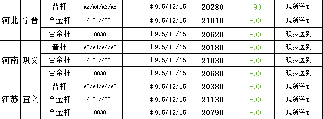 12月24日宁晋市场普铝杆现货报盘价20280元/吨,较上一交易日报价跌90元/吨;巩义市场普铝杆现货报盘价20180元/吨,较上一交易日报价跌90元/吨;宜兴市场普铝杆报盘价20380元/吨,较上一交易日报价跌90元/吨。