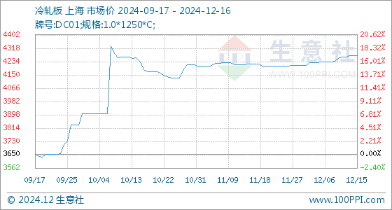 12月16日,生意社冷轧板基准价为4270.00元/吨,与本月初(4210.00元/吨)相比,上涨了1.43%。