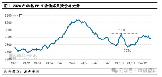 整体来看,四季度华北PP市场低熔共聚价格最高点在10月初的7900元/吨,最低点在10月下旬的7534元/吨。截止至12月23日,华北低熔共聚均价在7760元/吨,较12月初下跌65元/吨,跌幅在0.83%。华北PP市场低熔共聚疲态初现,随着前期检修装置陆续重启和生产企业积极转产,以及后期新产能的陆续释放,预计2025年1月华北区域内低熔共聚供应增长,低熔共聚价格重心将逐渐下移。