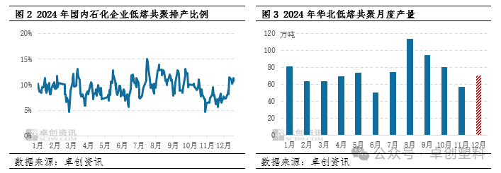 就华北区域低熔共聚供应来看,前期区域内燕山石化2PP、青岛金能二期两条线、河北海伟以及大唐多伦一线等多套涉及产低熔共聚的石化装置停车检修,华北低熔低熔共聚区域产量较前期缩量。据卓创资讯估算,2024年10月华北区域低熔共聚产量分别在80.34万吨,环比下降15.1%,11月低熔共聚产能在56.63万吨,环比下降29.51%。同时部分西北煤化工企业低熔共聚仍处于超卖状态,流入华北区域的货源体量较有限,华北区域低熔共聚市场现货供应较前期有所收紧,低熔共聚价格来自供应端的支撑较强。