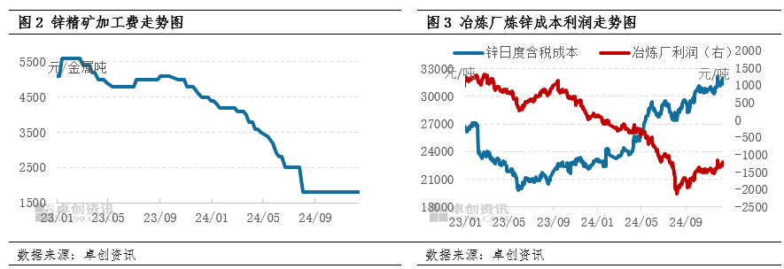 本年度价格重心的上移,主要在于原料锌精矿供应紧张,叠加市场情绪面和资金面偏强的影响。首先,原料端来看,由于全球锌精矿产出不佳,且有下滑预期,导致国内锌精矿进口也有所减少,整体供应收紧,在此影响下,锌精矿加工费不断下滑,至历史低位,冶炼厂炼锌利润也受到影响,出现了较大的亏损情况。根据卓创资讯监测,2024年锌精矿加工费震荡下跌,冶炼厂炼锌利润随之下跌,自盈亏线一路下跌至亏损2000元/吨以上,直至8月锌价上涨后,开始出现小幅回温迹象,目前仍处于亏损表现。