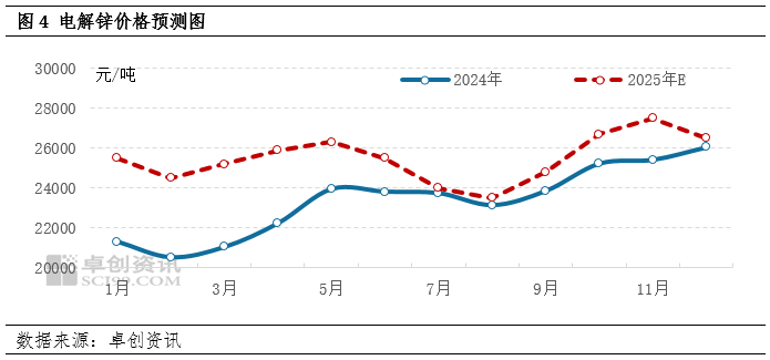 整体来看,预计2025年锌价震荡上行,日均价波动区间或在22000至28000元/吨之间,高点或出现在上半年的5月份,低点或出现在下半年的8月份,全年均价预计在24800元/吨左右,价格重心整体上移。