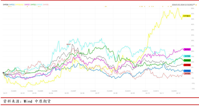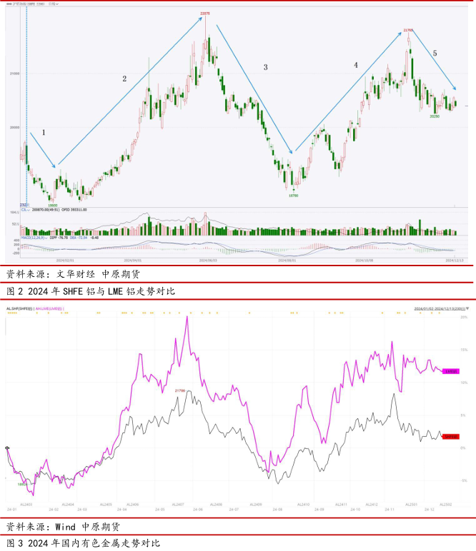 2024 年国内沪铝价格走势主要分为五个阶段:①1月-2月,沪铝价格从19600元/吨一线最 低下跌至18400元/吨一线,主要原因在于美国最新数据公布后,市场对美联储3月份开始降息 预期出现降温,同时国内进入春节假期,供需两端没有太多利好支撑。②3月至5月,沪铝价格 从18400 元/吨一线一路最高上涨至22000元/吨一线,主要驱动一是美国通胀数据仍有韧性, 对商品价格有所支撑,市场交易美联储6月份开始降息的预期;二是国内经济数据“开门红”, 叠加政策端出现利好,对国内有色金属板块有所提振;三是欧美地区再次制裁俄铝,LME和COMEX 市场拒绝俄铝新的仓单注册,海外铝价走强带动国内铝价;四是年初国内铝锭累库情况不及预 期,库存一直处于同期低位水平,对铝价也有一定支撑。③5月至7月,一方面,前期国内外宏 观利多预期逐步降温,商品整体从高位回落;另一方面,基本面来看,前期铝价涨幅较大对消 费有一定抑制,国内铝锭库存降库周期进展不及预期,库存由低于去年同期逐步变为高于去年 同期,铝价从高位逐步跌至年初低点一线。④8月至11月,随着国内宏观经济数据持续疲弱, 市场对政策端预期再次增强,9月份国内出台一系列利好政策,同时美联储正式宣布进入降息周 期,商品价格走出年内第二轮上涨趋势。另外,10月份,随着氧化铝价格持续创出新高,从成 本端对铝价也形成了有力支撑。⑤11月至12月,铝价再度承压回落。国内取消铝材出口退税政 策,对出口预期形成不利影响。海外特朗普赢得新一届美国大选,市场对其关税政策有较强担 忧,美元指数创出近两年新高,对商品形成一定压制。