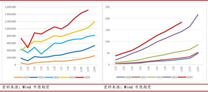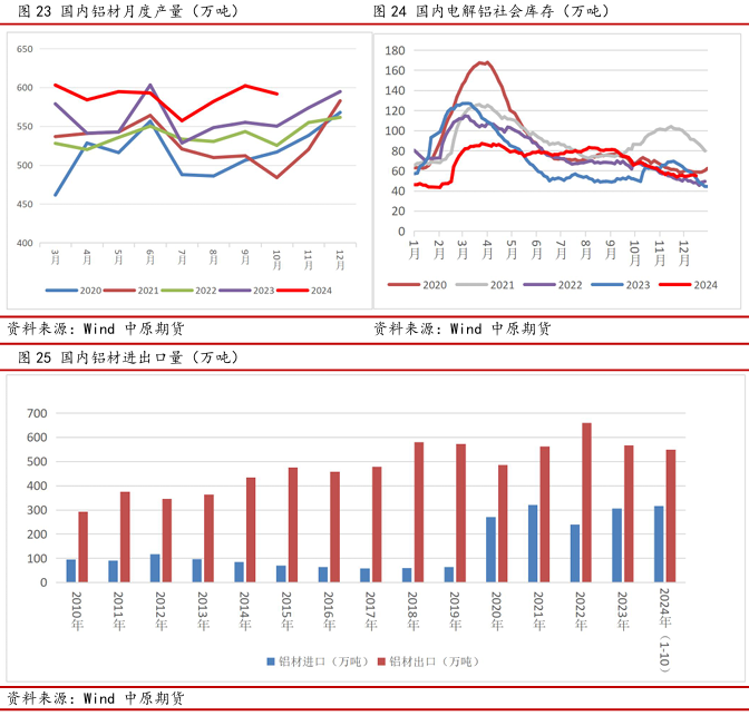 数据方面,国家统计局数据显示,2024年1-10月中国铝材累计产量5611.5万吨,同比增 长8.1%;其中产量排名前三的省份分别是山东(1236.5万吨)、河南(996.6万吨)和广东(480.7 万吨)。海关数据显示,2024年1-10月中国未锻轧铝及铝材累计出口549万吨,同比增长16.9%;1-10 月中国未锻轧铝及铝材累计进口317万吨,同比增长32.5%。今年铝价呈现外强内弱格局, 有利于国内生产企业布局出口,但是随着海外贸易壁垒加码,或对后期中国铝材出口造成一定 消极影响。