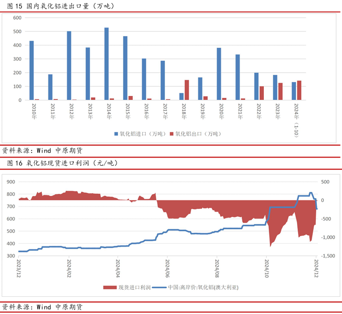 价格方面,截至12月13日,国内氧化铝现货价格报5757元/吨,年内累计涨幅约为84.4%;进口氧化铝(澳大利亚)FOB价格报680美元/吨,年内累计涨幅约为96.0%。1月,由于矿石品 位下滑及设备老旧成本高企等问题,美铝宣布二季度全面削减其在澳大利亚的氧化铝厂Kwinana, 影响达170万~180万吨产能。3月,澳大利亚昆士兰州天然气管道发生火灾,工业用气受到影响,力拓旗下两家氧化铝厂Yarwun、Queensland被迫减产120万吨,直到三季度才逐步恢复。10 月,EGA在几内亚矿山GAC出口受阻,加剧了中东地区的氧化铝厂AlTaweelah的减产风险。由于海外供应相对偏紧,海外价格上涨幅度明显大于国内,6月份之后出口创出逐步打开,国内 氧化铝出口量开始增加。