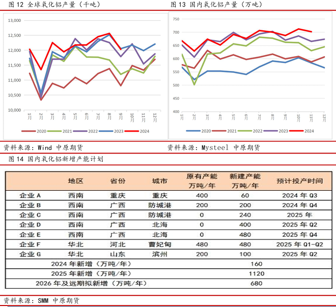 据Mysteel 统计,截至2024年11月,中国氧化铝建成产能为10370万吨,运行产能为8485 万吨;2024年1-11月,中国氧化铝产量为7496.9万吨,同比增长1.6%。2024年国内氧化铝新 增产能集中于下半年投产,预计新投总产能约160万吨。2025年,国内预计将有1170万吨新增 氧化铝产能投产,主要集中在广西、河北、山东等地区。2026年及远期拟建的新增产能仍有680 万吨。未来国内氧化铝新增产能均以使用进口铝土矿为主。