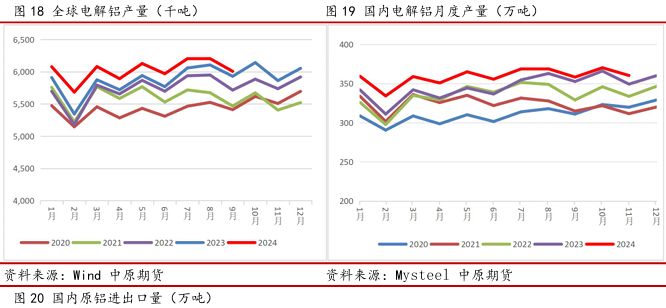据国际铝业协会(IAI)数据显示,2024年1-9月,全球电解铝产量5425.1万吨,同比增长 约3%。据Mysteel统计,截止11月底,国内电解铝建成产能约为4530.85万吨,国内电解铝运 行产能约为4357.93万吨;2024年1-11月份国内电解铝累计产量为3949.6万吨,同比增长4.1%。进入三季度后,云南地区电力充足,当地电解铝企业保持平稳运行,未能像往年一样出现季节 性减产。进出口方面,2024年1-10月份,国内原铝进口总量约为182.4万吨,同比增长约55.7%, 其中从俄罗斯进口占比约50%;1-10月份国内原铝出口总量约8.9万吨,同比下降约20.9%。国 内电解铝开工运行高位叠加进口增长,供应端整体较为充足。
