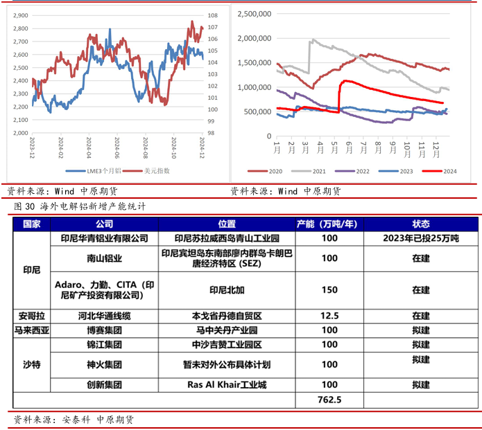 未来,海外新增电解铝产能主要集中在印尼、马来西亚等东南亚国家,但相比国内来说, 海外建设周期较长,2024年投产仅印尼华青25万吨及俄铝泰舍特等项目有投产预期,其他的产 能均再建或拟建中。值得注意的是,印尼国内电解铝建成产能有望在2026年左右达500万吨, 成为亚洲未来重要的电解铝供应国。