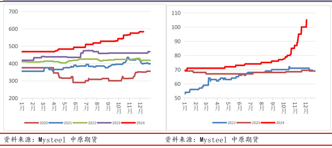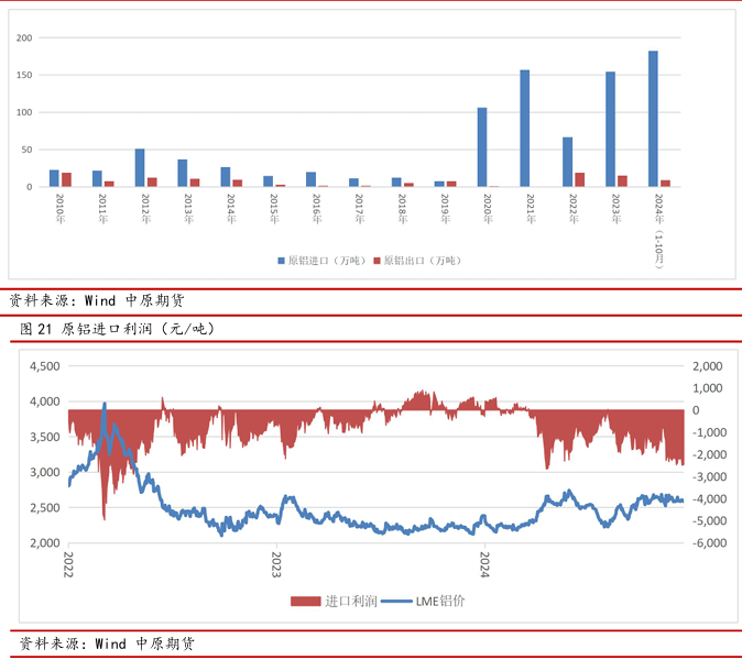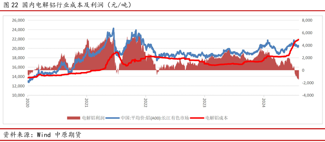 成本利润方面,根据安泰科测算,2024年11月中国电解铝加权平均完全成本(含税)为 19786 元/吨,当月平均利润为1003元/吨,为近两年最低水平。预估11月份中国电解铝全行业 亏损面超过三分之一,河南、广西等高成本地区的铝厂面临着减产检修的压力。