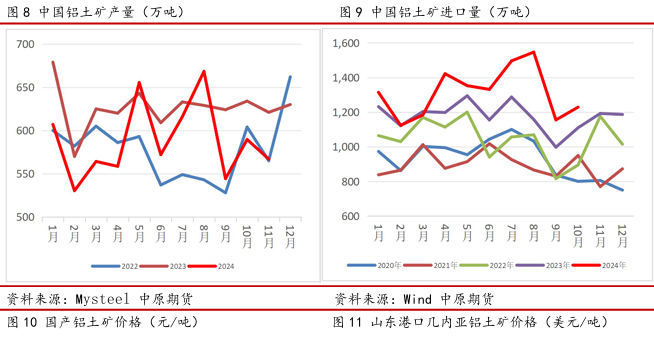 国产矿方面,据Mysteel数据显示,2024年1-11月,国内铝土矿(山西、河南、贵州、广 西地区)产量约为6472.9万吨,同比下降6.0%,受环保等政策因素影响,国产矿石供应量难以 出现明显增长。进口矿石方面,据海关数据显示,2024年1-10月中国进口铝土矿13156.5万吨, 同比增加11.9%。分国别看,自几内亚进口9193.3万吨,同比增长10.9%,占进口总量的69.9%;自澳大利亚进口3299.2万吨,同比增加18.3%,占进口总量的25.1%;国内铝土矿进口来源地 高度集中于几内亚和澳大利亚。几内亚是全球重要的铝土矿供应国,其铝土矿资源储量大、品 位高。2023年几内亚的铝土矿产量为1.22亿吨,同比增长19%,预计2024年-2026年产量将分 别达到1.44亿吨、1.67亿吨和1.96亿吨。但几内亚政治局势的不稳定和当地基础设施发展较 慢将成为影响铝土矿供应和出口的最大因素。