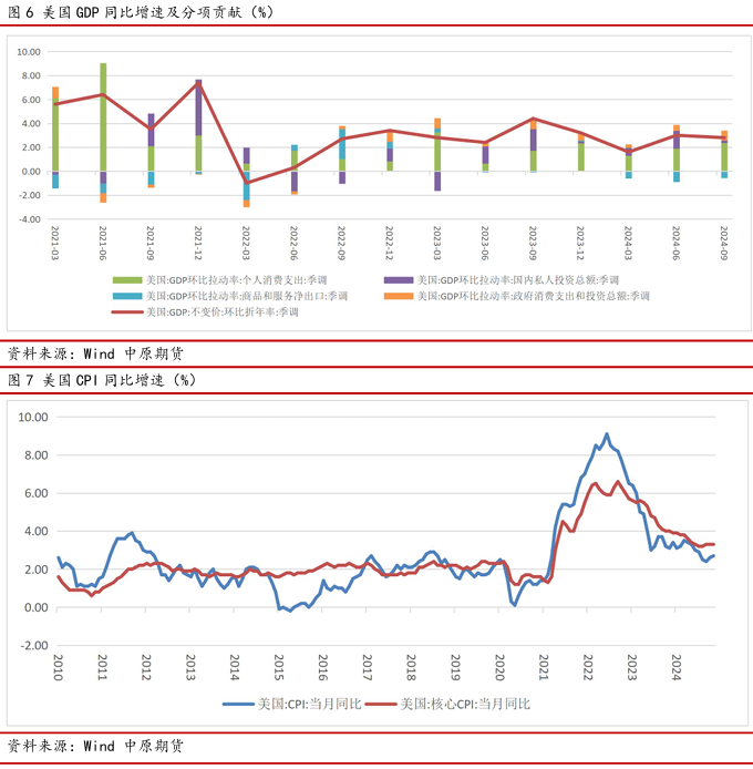 美联储于2024年9月份正式宣布降息,截至11月份,年内累计降息75个基点,预计12 月份继续降息25个基点,2025年降息空间约为100个基点。此次降息是预防式降息,一方面, 美国经济仍有韧性,2024年前三季度美国GDP增速为2.8%,衰退风险较低。另一方面,随着特 朗普即将就职新一任美国总统,市场预期美国通胀反弹的风险较大,对美联储后续进一步降息形成干扰,美联储将会根据经济数据的最新情况来调整降息路径。