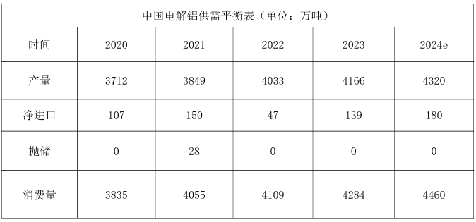 预计2024年国内电解铝总需求预计同比增长4.1%(或176万吨),其中地产消费下降约 80 万吨,电子电力消费约增长90万吨,交通运输增长约65万吨,耐用品消费增长约30万吨, 出口增长约70万吨。