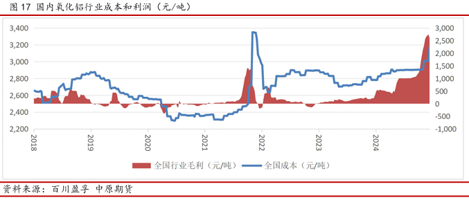 成本方面,据百川盈孚统计,2024年11月中国氧化铝行业含税完全成本平均值为3115.65 元/吨,年内基本维持在2800-3100元/吨之间,主要受原料端铝土矿价格上涨影响,烧碱、动 力煤等原料价格涨幅有限,对氧化铝成本上升影响不大。因此,随着氧化铝价格年内整体上涨, 行业利润逐步扩大,6月之后行业利润一直处于1000元/吨以上的历史高位水平。