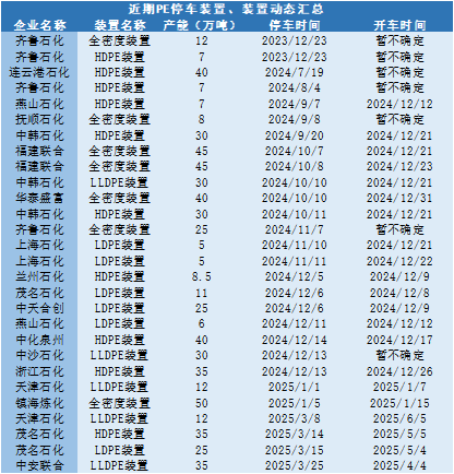 2024年12月,预计PE装置的检修损失量约为27.08万吨,环比减少40.27%,同比增加31.72%。下旬,中韩石化、福建联合等共约230万吨的停车装置计划重启,尽管有部分石化企业装置短停,但难以抵消重启装置带来的影响,检修损失量环比大幅下降。根据现有检修计划,2025年一季度检修装置较少,涉及产能仅为169万吨。随着前期重启装置的影响逐渐扩大,以及12月停车装置的陆续重启,预计一季度供应端将显著增加。