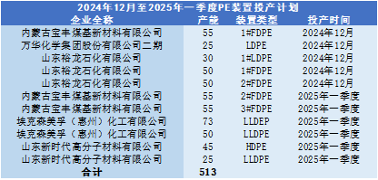 2024年12月,中国预计将迎来一波聚乙烯产能的集中释放,包括内蒙古宝丰、万华化学和山东裕龙在内的多个项目,共计约210万吨的新装置将正式投产。据悉,内蒙古宝丰的55万吨装置已顺利落地,而山东裕龙的新生产线于近期开车。预计到2024年底,中国的PE总产能将达到3596万吨。2025年第一季度,中国约有303万吨的PE装置计划投产,产能仍处于高速增长阶段。伴随着2024年12月投产的装置逐步提高运行负荷,2025年一季度市场供应压力预计将显著上升。尽管部分企业可能会选择推迟投产时间以减轻短期内对市场的冲击,但整体来看新装置的投产仍将在供应端产生重要影响。