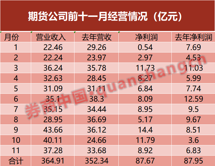 数据显示,今年前11个月,期货公司实现营业收入364.91亿元,较去年同期增长3.56%;实现净利润87.67亿元,几乎接近去年同期的87.95亿元。