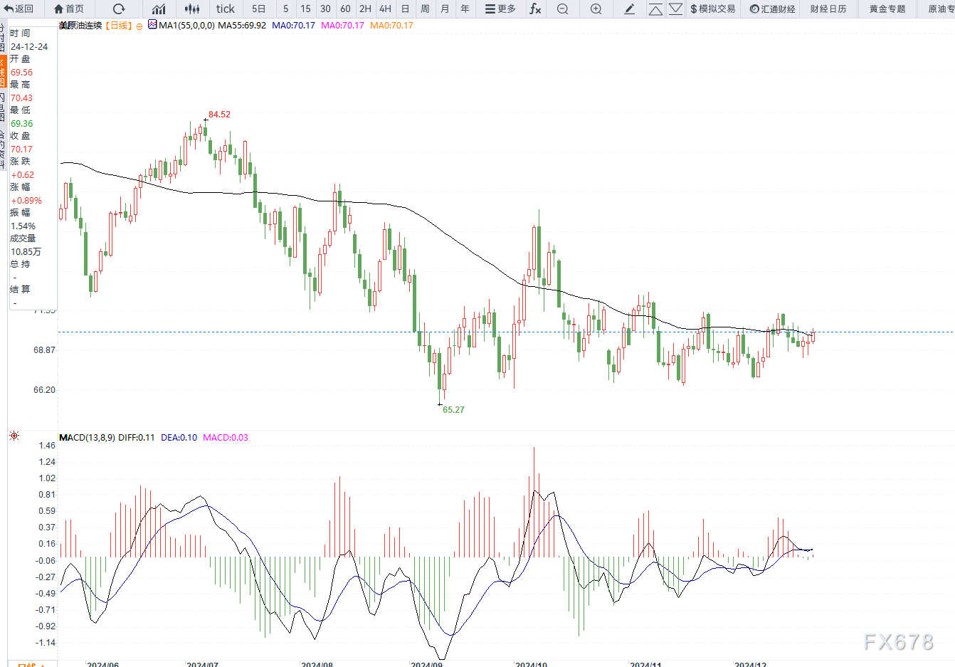 汇通财经APP讯——周三(12月25日)圣诞假期休市之前,美原油报收70.17美元/桶,重回区间震荡中轴线附近,2024年油价整体呈现震荡下行走势。