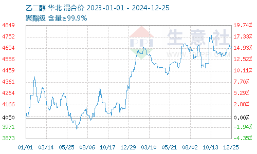 12月乙二醇价格高位震荡运行。据生意社数据显示,截止12月24日,国内油制乙二醇均价为4671.67元/吨,较12月1日乙二醇均价4591.67元/吨,上涨1.74%。