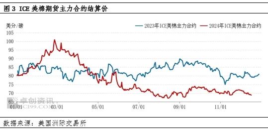 12月份USDA供需报告上调全球棉花产量及期末库存,同时上调美棉产量及库存,基本面利空影响使市场参与者对棉市看跌情绪增强。在此期间,美元震荡上涨,使得美元计价的棉花对持有其他货币的买家来说更加昂贵,降低了部分需求方对美棉的采买热情。尤其是作为最大买家的中国,今年进口美棉占比明显下降,而性价比优势明显的巴西棉对美棉替代影响已逐步显现。据卓创资讯监测,12月份外盘ICE美棉主力合约价格持续下滑,截至12月20日主力合约结算价为67.91美分/磅,较12月首个工作日下跌5.59%。