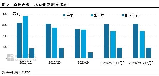 【导语】12月份USDA全球棉花供需报告数据显示,2024/25年度全球棉花产量及期末库存上调;其中美棉产量已连续两个月上调,限于出口有限,期末库存也继续回升,棉花市场基本面供过于求矛盾突出。另外12月份美元偏强运行,全球贸易发展不确定性因素的存在,使棉花市场利空压力增强,国内外棉花价格进一步下滑。若2025年1月需求延续疲弱,棉价或继续探底。