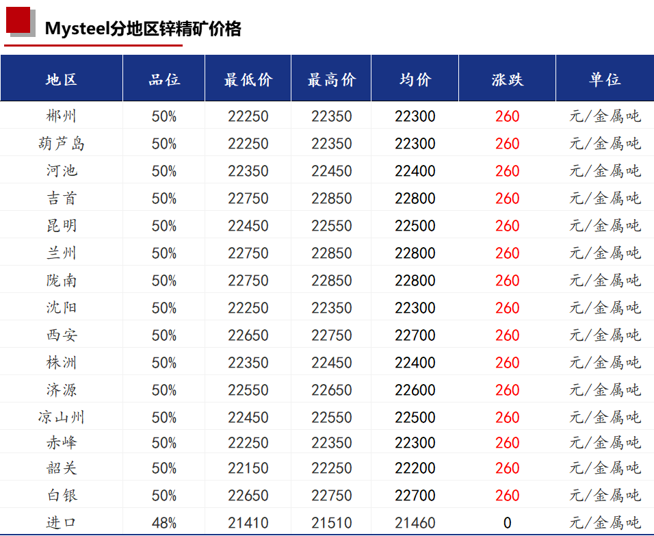 今日国内锌精矿加工费各地区加工费均未调整,和上一交易日持平。受锌价的影响,锌精矿价格上涨260元/金属吨。进口TC今日持稳,市场主流报价-45至-25美元/干吨。