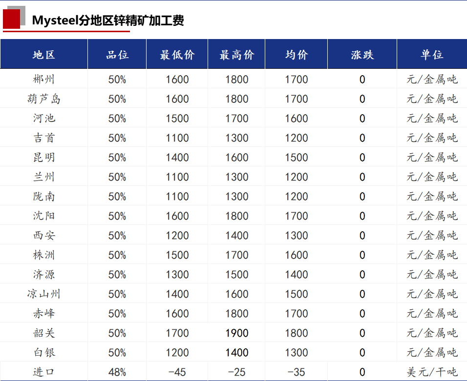 华南地区:广西某锌锭生产企业50品位锌精矿加工费1800元/金属吨到厂。
