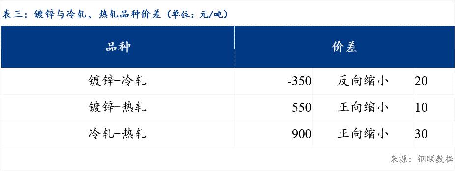 重庆、上海地区冷轧板卷区域价差缩小40元/吨,重庆、广州冷轧板卷区域价差缩小20元/吨;重庆、上海镀锌板卷区域价差缩小20元/吨,重庆、广州镀锌板卷区域价差维持不变。镀锌、冷轧品种价差反向缩小20元/吨;镀锌、热轧品种价差缩小10元/吨;冷轧、热轧品种价缩小30元/吨。