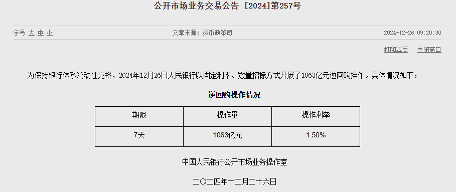 中国网财经12月26日讯今日,人民银行网站显示,为保持银行体系流动性充裕,2024年12月26日人民银行以固定利率、数量招标方式开展了1063亿元逆回购操作,操作利率为1.50%。