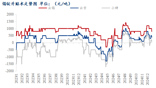 今日套盘商对沪锡2501合约套盘云锡升水800元/吨左右,普通云字升水400-500元/吨;小牌升水100元/吨左右,进口锡贴水600元/吨左右。