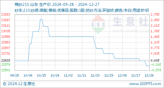 12月27日生意社棉纱21S基准价为22566.67元/吨