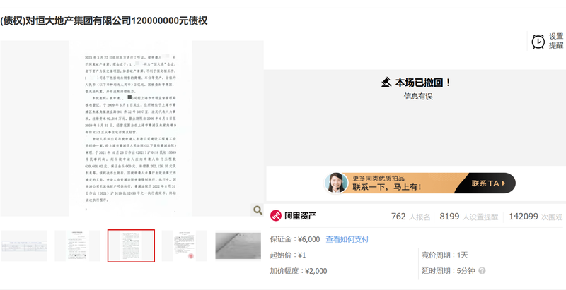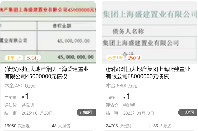 同时被撤销的还有2个标的,分别是:对恒大地产集团上海盛建置业有限公司4500万元债权,起始价1元,约1.3万次围观,48人报名,将于2025年1月20日开拍;对恒大地产集团上海盛建置业有限公司6800万元债权,起始价1元,约2.47万次围观,83人报名,2025年1月10日开拍。债权人均是早田公司。