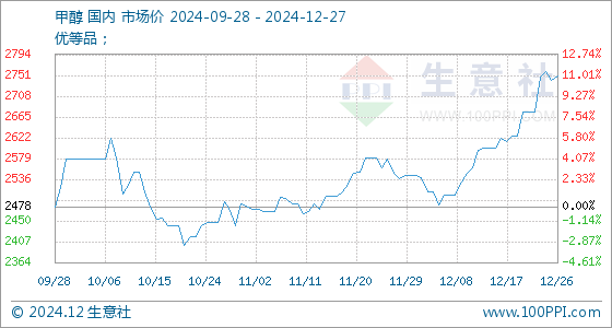 12月27日,生意社甲醇基准价为2750.00元/吨,与本月初(2544.17元/吨)相比,上涨了8.09%。