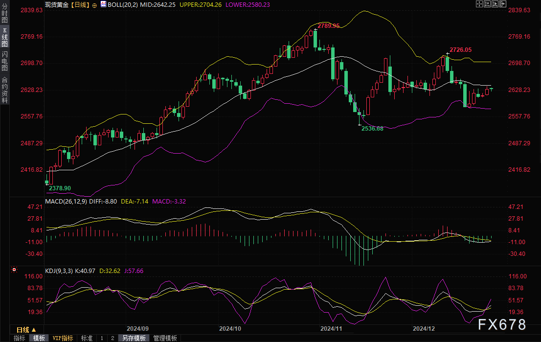 汇通财经APP讯——周五(12月27日)亚市盘初,现货黄金窄幅震荡,目前交投于2632.87美元/盎司附近。金价周四在圣诞假期后的清淡交投中上涨,盘中最高曾触及2639.02美元/盎司,为近一周新高,收报2633.49美元/盎司,受避险需求推动,市场在等待即将上任的特朗普政府领导下的美国经济的以及美联储2025年利率策略的信号。