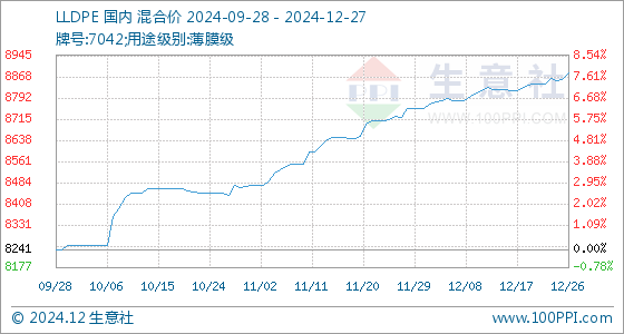 12月27日,生意社LLDPE基准价为8881.67元/吨,与本月初(8755.00元/吨)相比,上涨了1.45%。