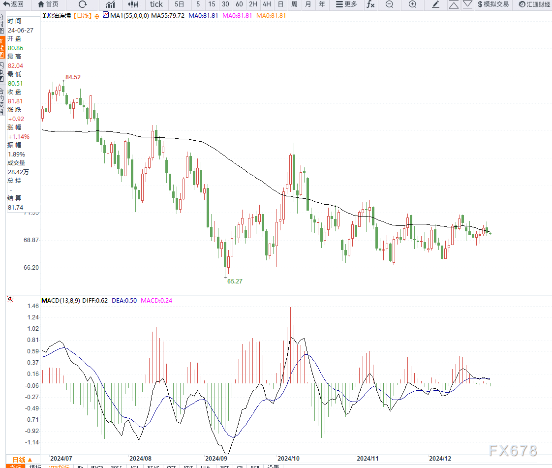 技术层面上来看,美原油日线依然处于震荡之中,且围绕55日均线盘整,目前MACD再次死叉向下,维持箱体对待,日内留意68.50美元附近支撑是否有效。