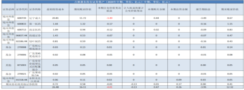 同期,第二名的吉林敖东在对辽宁成大投资上亏损不少,最初投资成本20.81亿元,上半年亏损了3.49亿元。这家制药厂还持有了第一医药、南京医药等证券资产;广发基金各类基金产品,期间累计浮亏4亿元,具体如下表。