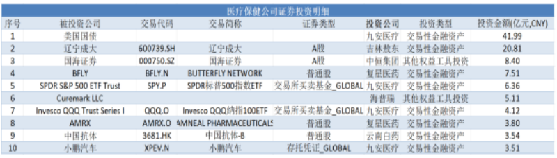 从被投资标的来看,九安医疗投资了近42亿元的美国国债高居榜首;吉林敖东购买了约21亿元的辽宁成大次之。此外,国海证券、标普500ETF指数基金、中国抗体、小鹏汽车等均是较为热门的投资标的,具体如下表。