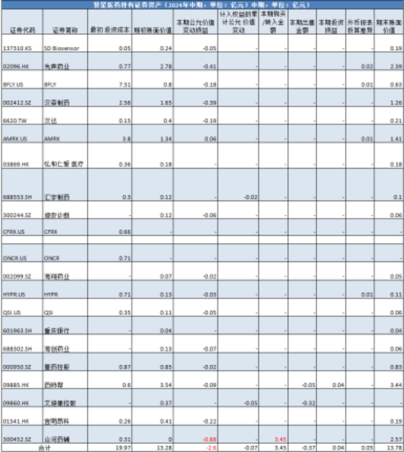 排名第三的复星医药在今年上半年浮亏2.6亿元,其中持有的山河药辅浮亏最多,约8800万。值得注意的是,复星医药在亏损时选择了“补仓”,上半年又加仓了3.45亿元。此外,复星医药在先声药业、汉森制药、宜明昂科等股票资产有着不同程度的亏损,具体如下表。