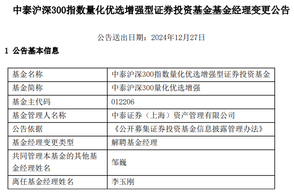 中国经济网北京12月27日讯今日,中泰证券(上海)资产管理有限公司公告称,李玉刚离任中泰沪深300量化优选增强(A类012206;C类012207)。