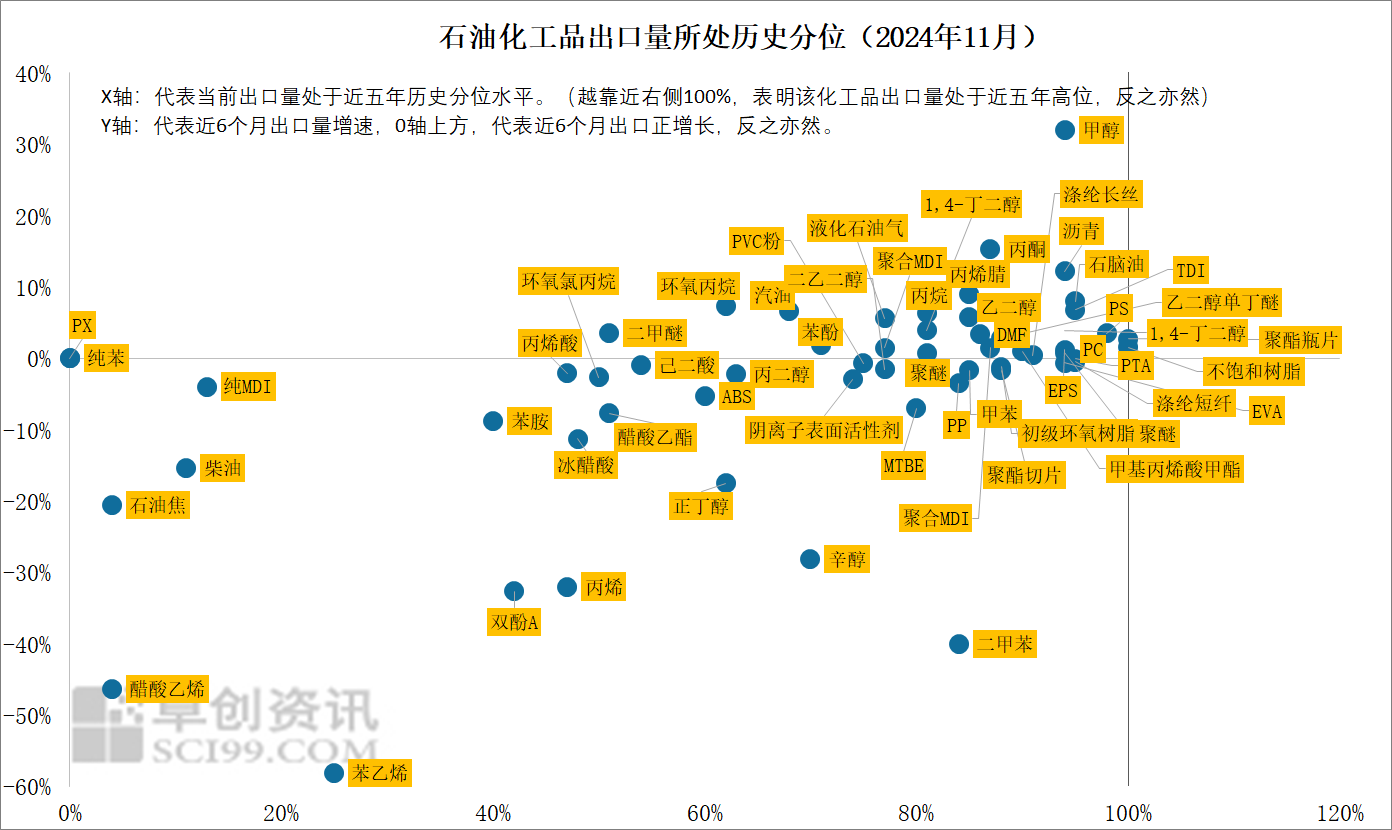 卓创资讯重点监测的62类主要石化产品中,有48%的产品11月出口量处于近五年80%以上分位水平,说明当前石油化工产品出口量处于较高位置。