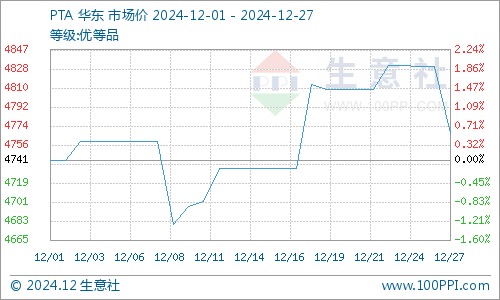据生意社商品行情分析系统,12月份国内PTA现货市场行情呈现震荡调整,截止12月27日华东地区PTA市场均价在4767元/吨,较月初上涨0.55%。