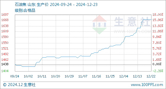 12月23日,生意社石油焦基准价为1673.00元/吨,与本月初(1540.25元/吨)相比,上涨了8.62%。