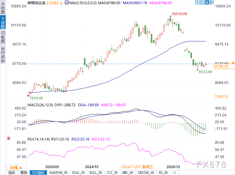 汇通财经APP讯——周五(12月27日),马来西亚棕榈油期货市场迎来了新的一周。在经历了连续两周的下跌之后,棕榈油期货价格在周五出现了反弹,这一变化主要得益于市场对低价的追捧以及竞争对手油脂价格的走强。具体来看,基准棕榈油合约FCPOc3在马来西亚衍生品交易所的收盘价为每吨4,625林吉特(约合1,035.14美元),较前一交易日上涨了82林吉特,涨幅达到1.8%。