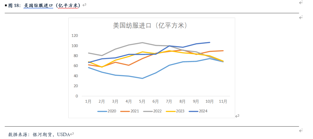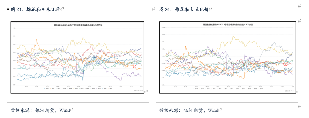 2、第二阶段(4、5月份到9、10月份):国内市场来看,该阶段市场开始关注新年度种植情况,本年度新疆地区棉花产量超预期增产使得全年棉花供应情况大概率维持充裕水平。新棉种植方面,预计新疆棉种植面积维持甚至略增,在未出现极端天气影响的情况下,新年度新疆地区棉花产量大概率维持高位。建议该阶段关注天气情况,之后随着“金九银十”到来,新年度棉花产量以及收购将开启,届时籽棉收购价格以及下游订单情况会对市场有较大影响。国际方面,从美国粮比价情况来看预计新年度棉花种植面积较本年度相差不会很大,而该阶段前期是天气炒作高峰,建议关注具体天气是否会出现极端影响从而影响美棉产量。此外,特朗普上台对中国产品可能会增加高关税,届时可能会对中美关系以及美棉订单出口有较大影响。
