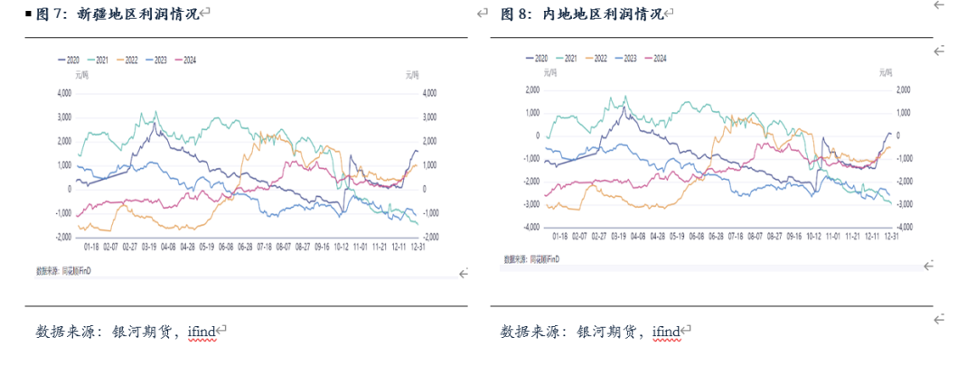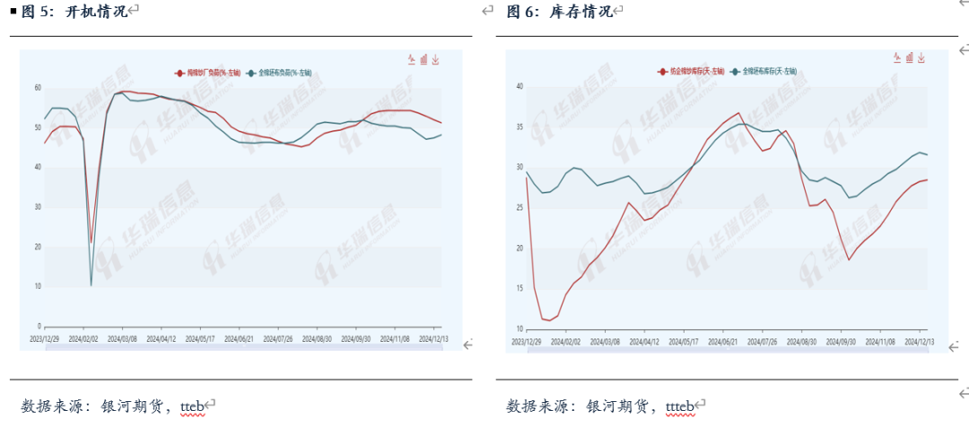 需求端目前市场订单情况表现一般,下游各环节对后市处于偏谨慎态度,此外,据悉今年春节时间较早,部分纺织企业放假时间较早,预计下游消费情况表现一般。当前开机情况来看,根据tteb最新数据,当前纱线开机率表现一般,处于历年同期中位;坯布开机情况也处于历年同期中位。利润情况来看,目前内地地区纱线利润近期虽有所好转但仍处于亏损状态,新疆地区近期利润表现较之前相比有所改善,甚至略有盈利。库存情况来看,当前纱线、坯布库存随着订单增量有限使得近期开始有累库迹象。