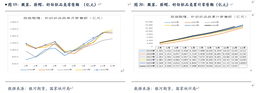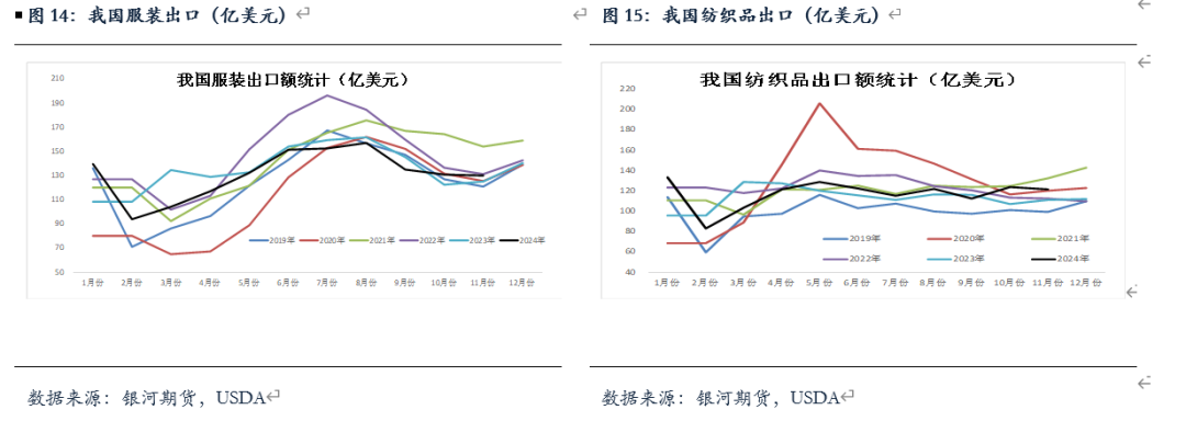内需来看,今年整体来看内需表现一般,11月份开始有所转弱,考虑到12月可能会有冬季消费的情况,预计短期可能会有所回升,根据国家统计局最新数据,1-11月我国服装、鞋帽、针纺织品类零售额为13073亿元,同比增加0.4%。11月份服装、鞋帽、针纺织品类零售额为1480亿元,同比减少4.5%。2025年预计随着国家刺激消费的政策实施,可能会对纺织品服装消费带来一定提振,但考虑到政策周期可能会在后期才有所显现。