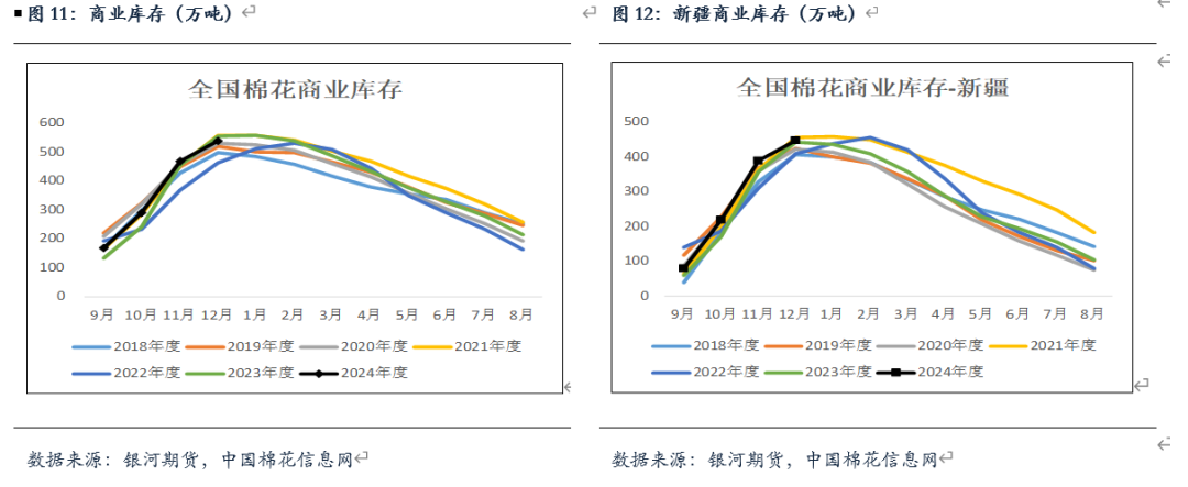 第三阶段:国内市场9月下旬一方面临近新棉上市,对开秤价格以及收购情况有一定上涨预期以及对消费旺季有一定预期,另一方面国内宏观政策刺激带动整体市场情绪偏强,郑棉走势最高涨至14600元/吨附近。但今年新棉产量增产超预期且收购价格偏低且表现相对稳定导致今年皮棉加工成本相对偏低,此外,“金九银十”旺季不旺,市场关注点转移至弱需求,导致盘面价格跌至13300元/吨附近。